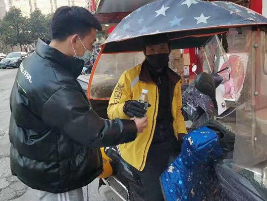 图为队员严子杰为外卖员送水。中青网通讯员 严子杰 供图