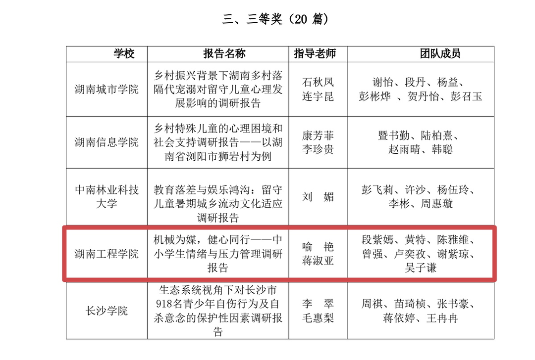 湖南日报·新湖南客户端10月27日讯(通讯员 吴子谦 曾强)近日,第四届湖南省高校“健心践行”暑期社会实践调研报告评选结果公布。湖南工程学院机械工程学院提交的《机械为媒,健心同行——中小学生情绪与压力管理调研报告》获三等奖。