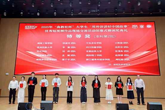 9月21日上午,2025年“高教社杯”大学生“用外语讲好中国故事”优秀短视频作品现场交流活动闭幕式暨颁奖典礼在江汉大学举行。我校外国语学院陈亚琼、龙思睿指导,向易伟、侯雨坤、段素晴、周灿、杨语嫣团队创造的作品《燃不尽的烈焰舞不尽的热爱》斩获全国特等奖。学校首次获此赛项国赛优秀组织单位。
