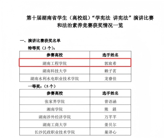 本次大赛由湖南省教育厅主办,是深化宪法法治教育的重要平台。比赛全面考察选手的法治知识水平、逻辑思维能力和语言表达能力,吸引了全省各高校学子踊跃参与。经过多轮选拔与精彩角逐,仅有三名选手脱颖而出,获特等奖。